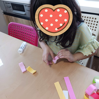 折り紙で輪飾りなどにも挑戦!のりで輪をつないでいきます。リボン🎀の形の飾りをつくる子も!